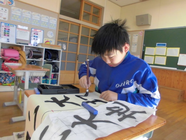 4年生は、書写をしていました。先日の書き初め大会を休んでしまったので、今日、改めて書き初めをしています。