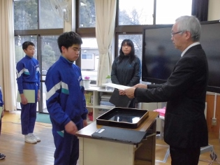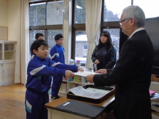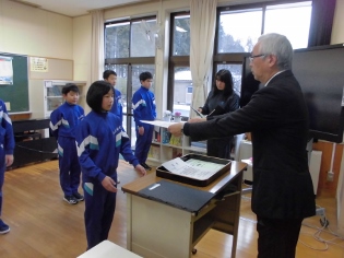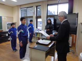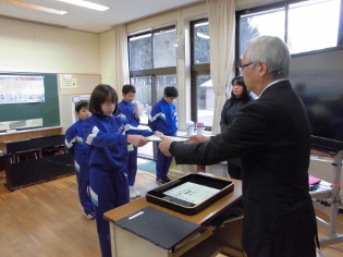 今朝のさわやかタイムでは、方部書写造形展と版画展の表彰がありました。