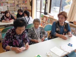 折り方の見本を見せながら、一緒になって活動しました。完成したメダルを掛けてプレゼントしました。