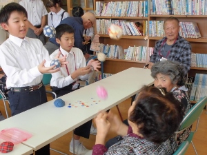 その後は、昔遊びを一緒にしました。敬老会の方々は、お手玉もけん玉も上手で今度は子ども達が教えて頂いていました。