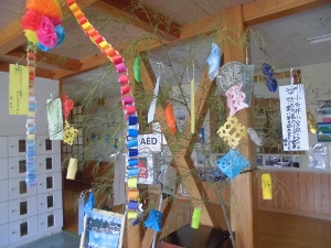 用務員さんが用意してくれた、玄関の笹に飾り付けをしました。みんなの願い事が叶うといいですね。