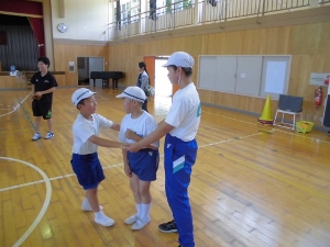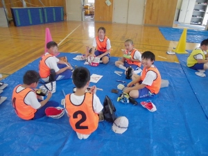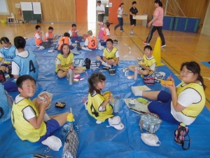 そして、三校入り交じったチームでのドッヂビーです。みんな汗だくになりながら、本気になって取り組みました。最後に、チームごとに、みんなで仲良くお弁当を食べました。