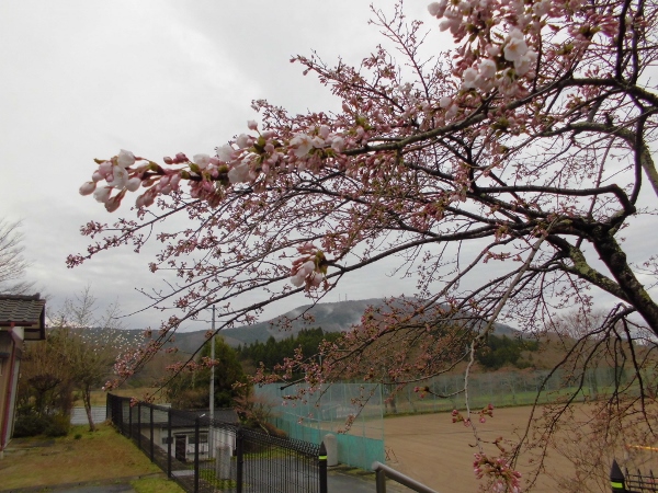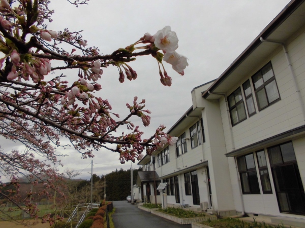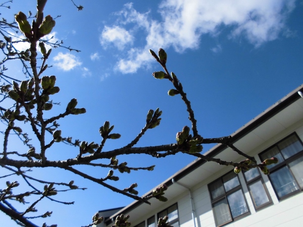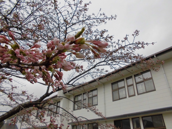 今日の小白井は曇り空、吹く風も冷たく感じますが、校地内の桜が開花しました。