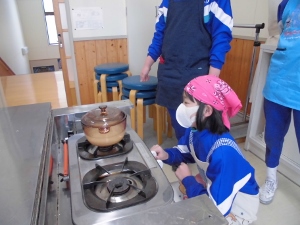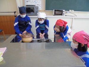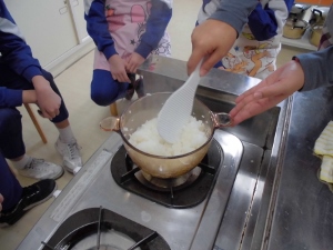 お米が炊きあがるまでの様子をしっかり観察しました。こげないように・・・・。