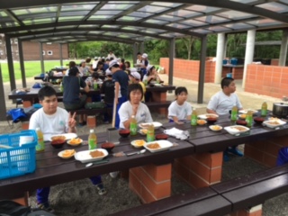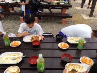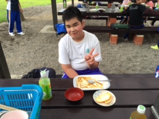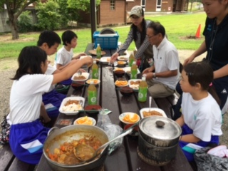 5年生宿泊活動での野外炊飯。カレーが上手にできました。いただきまーす。