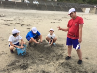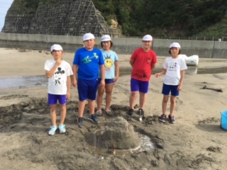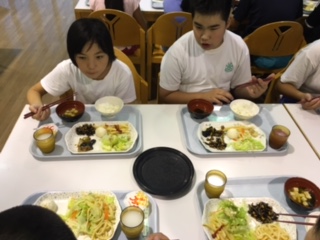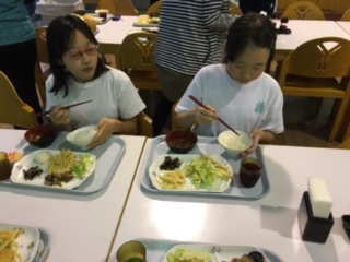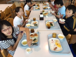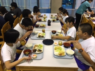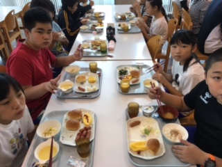 2日目の朝食です。みんな元気そうです。今日は四倉海岸に移動して磯遊び、魚釣り、砂の芸術を体験します。元気に活動してくださいね
