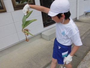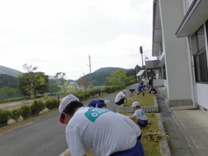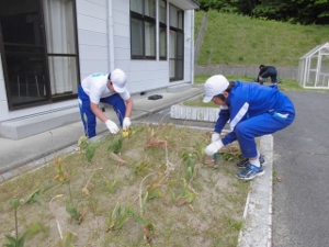 今日のお昼休みは、全校生で花壇整備を行いました。春にきれいな花を咲かせていたチューリップの球根を抜きました。その後、これから花の苗を植えることができるように草むしりもしました。