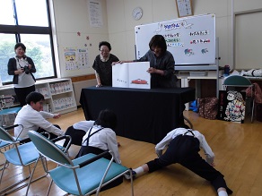 音楽室での講義では、4年前のことやどんな場面でも冷静に行動することなどをお話しした後、去年の避難訓練の時の復習を行いました。そのときには、机の下に避難する際に机の脚を持って机が動かないようにして、頭を守ることをもう一度確認しました。