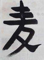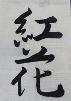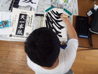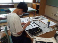 小学生は楷書で「麦」、中学生は行書で「紅花」です。手本を見るタイミングや筆の払い方など細かな動作についてもアドバイスをもらいました。短い時間ではありますが、作品を見ると、前回よりも上達していることがよくわかります。