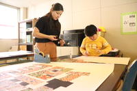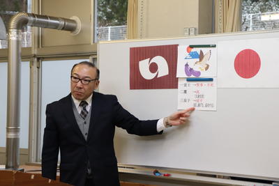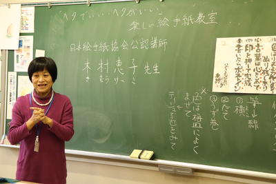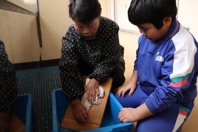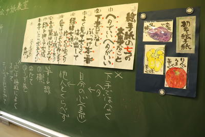 横看板は、一人ひとりの個性が学び合う様子と、川前の色づく景色をイメージして、千代紙を貼って作りました。