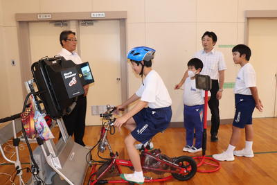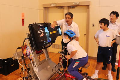 交通教室では、平中央自動車学校の講師の皆様をお招きし、“自転車シミュレーター”を使って自転車の正しい乗り方を学びました。