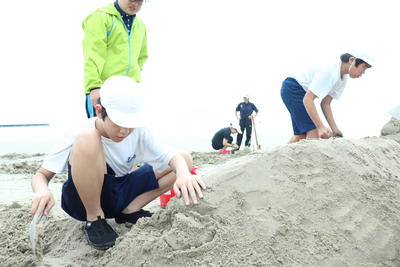 先生方の手助けもあり、スコップを支柱にしたり、貝殻を歯に見立てたりして、口を大きく開けたサメが立派にできあがりました。