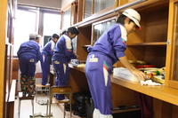 机や配膳台を廊下に出して、みんなで一列になってぞうきんがけを行いました。