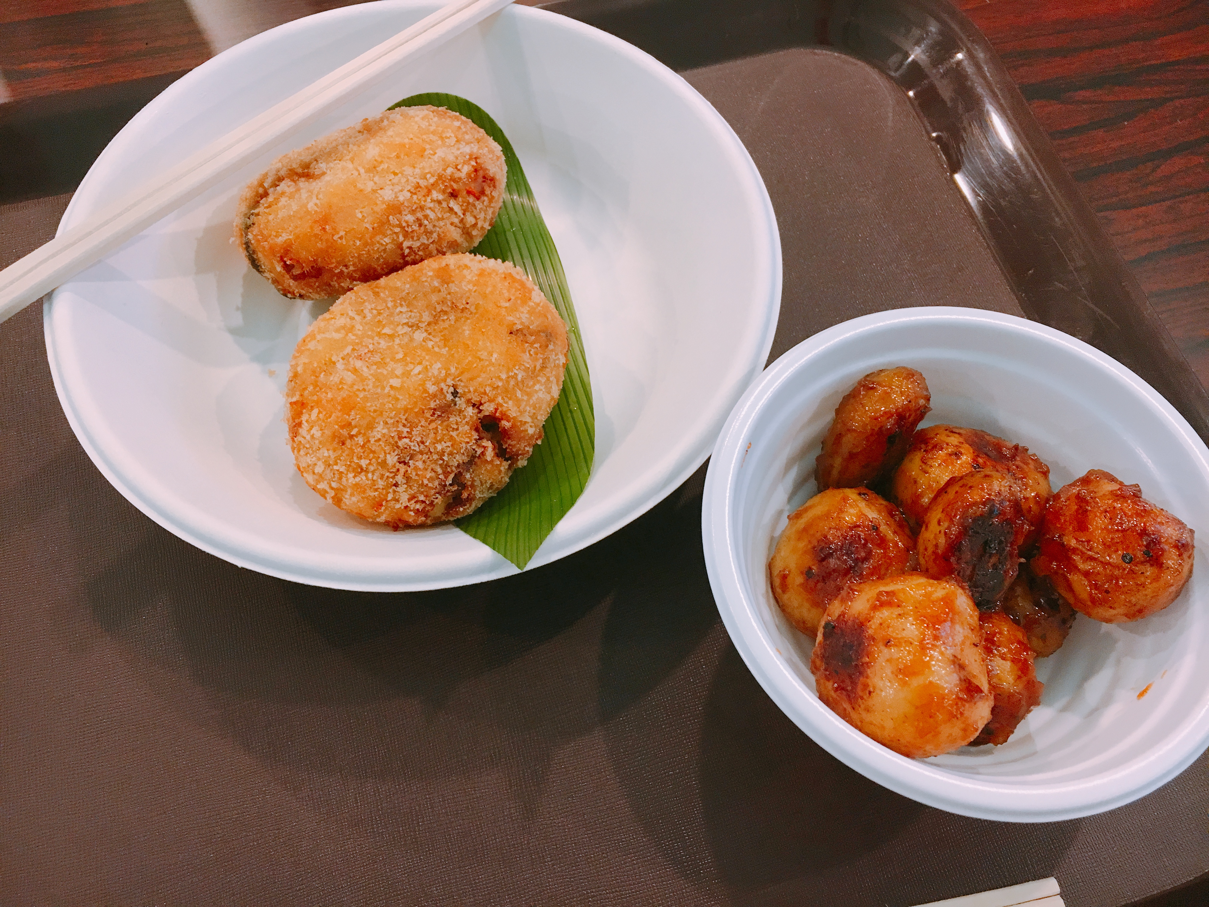 早速屋台にお邪魔して、「きじコロッケ」と「新じゃがの味噌がらめ」をいただきました。