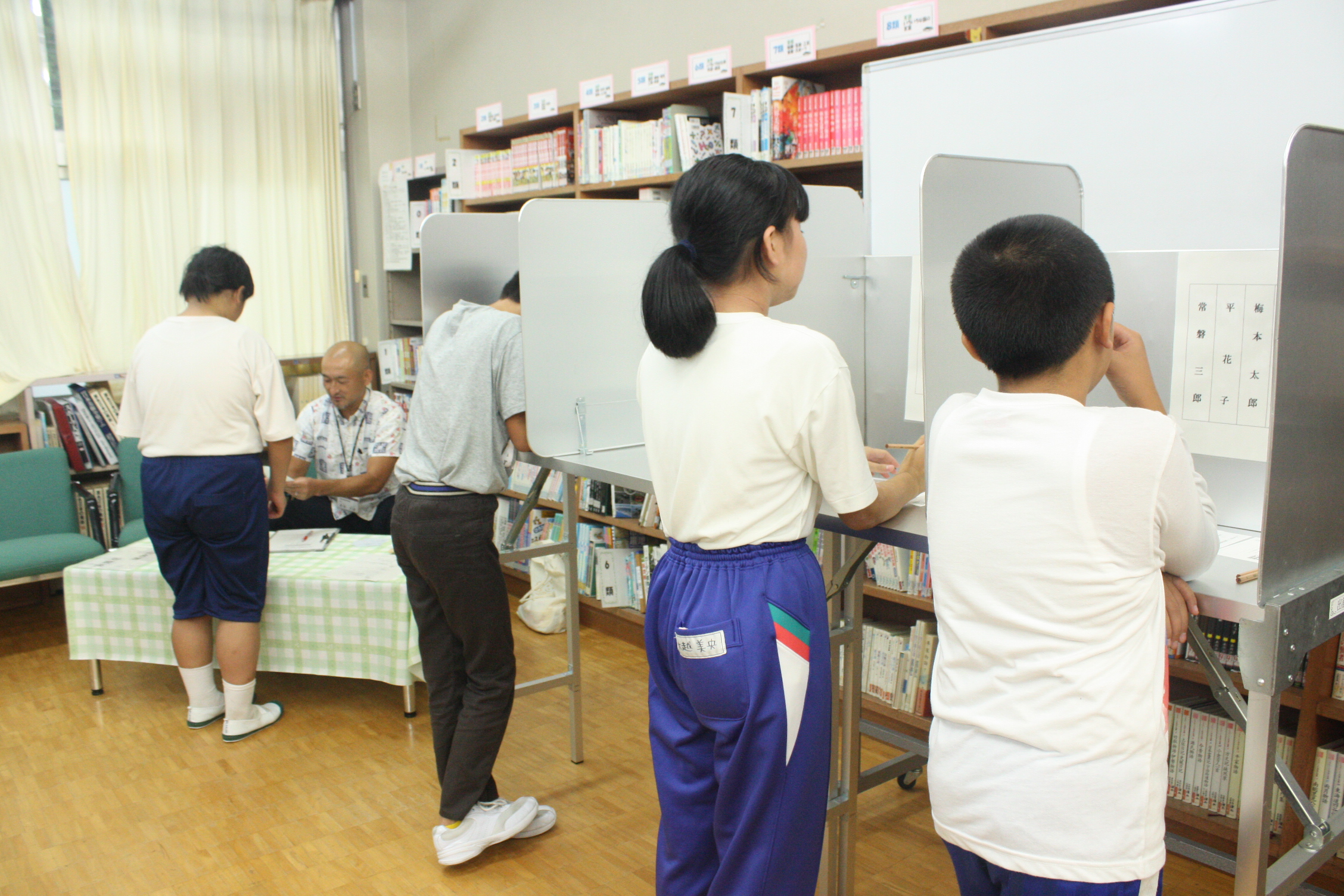 そして、実際の投票箱や投票記載台をお借りして、受付から出口調査まで本番さながらに模擬選挙を行いました。