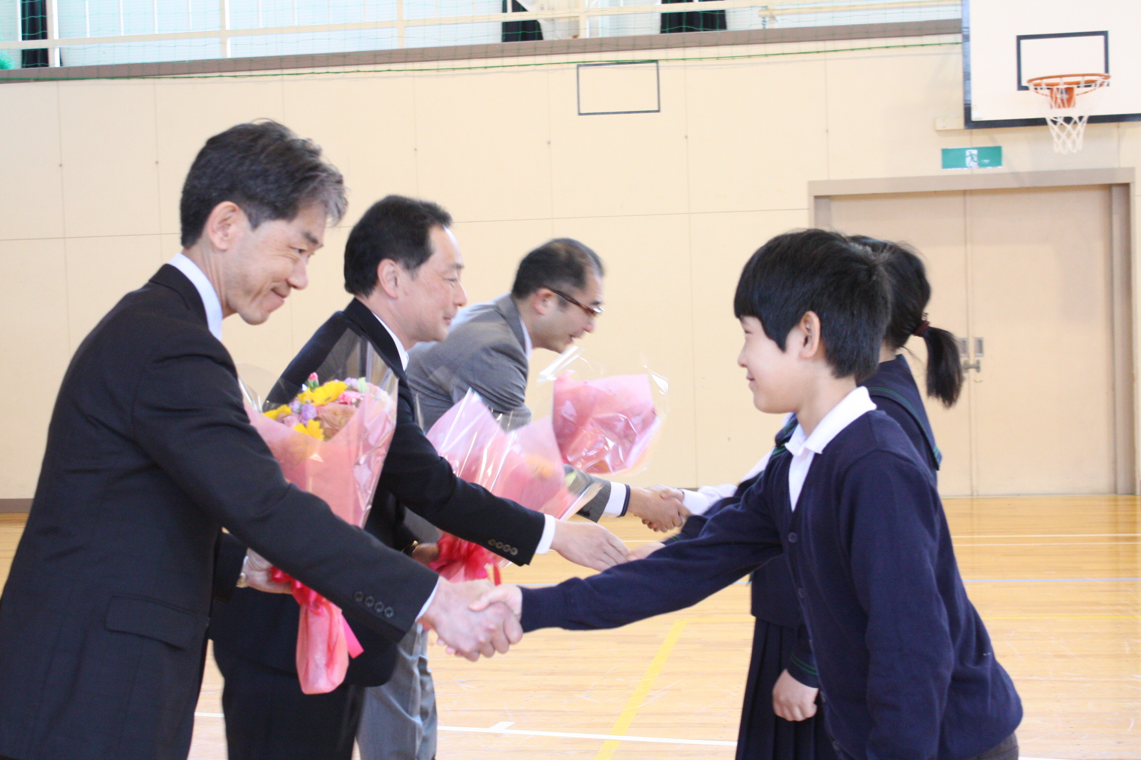 最後に、児童生徒たちから花束が贈呈され、校庭でお見送りをしました。