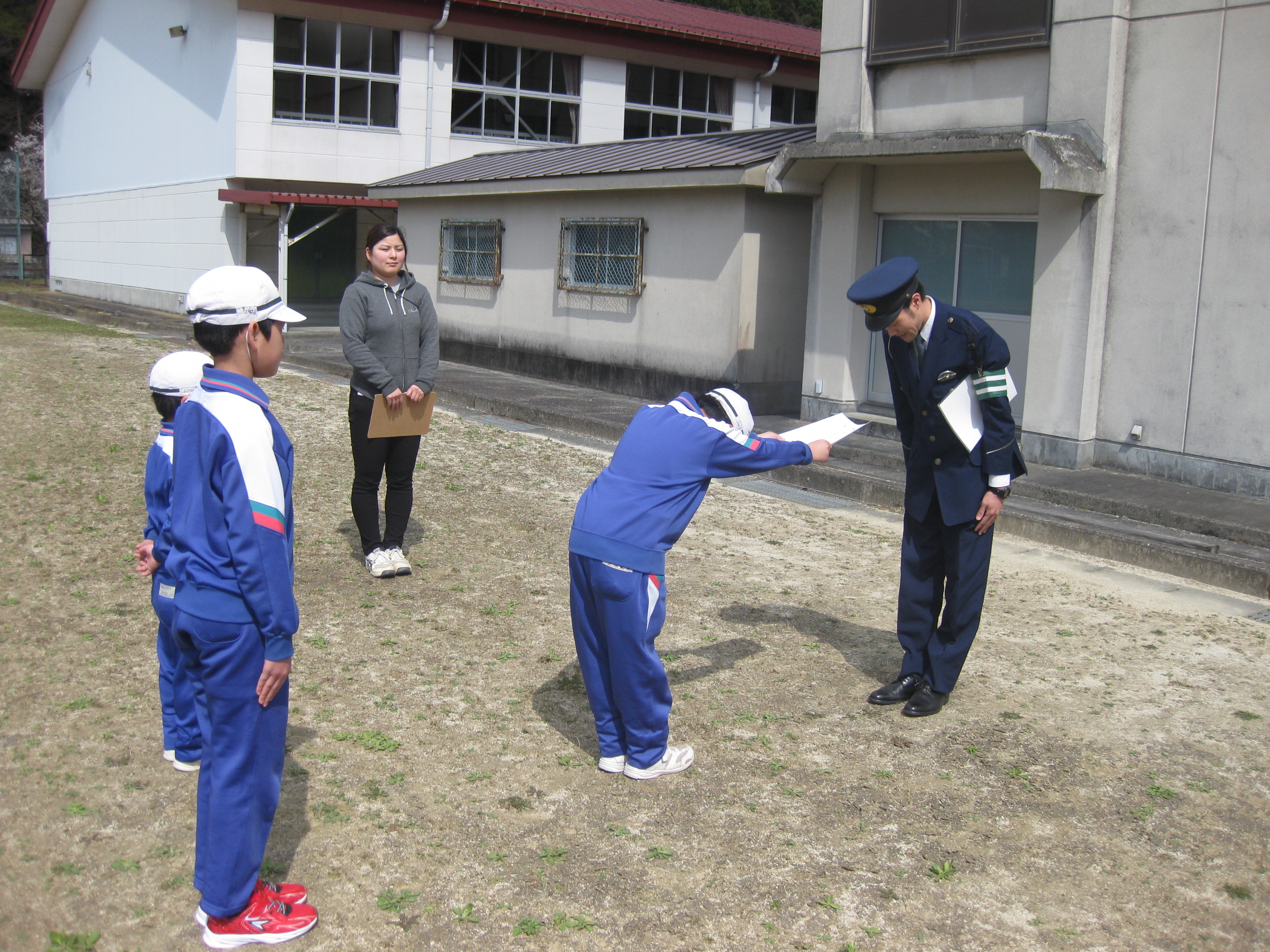 まず、小学6年生に「家庭の交通安全推進員」委嘱状が授与されました。