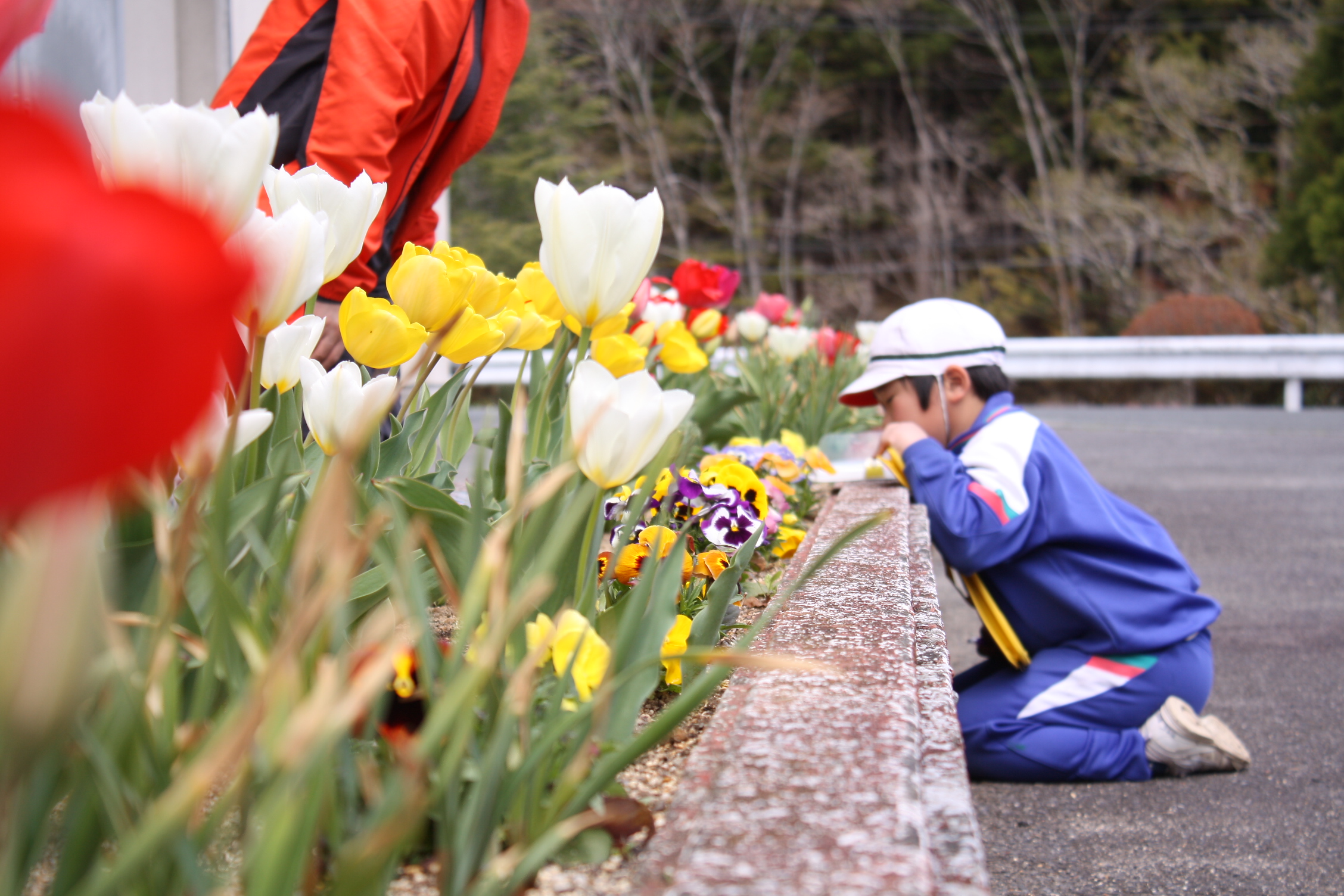 昨日の強風で桜はほとんど散ってしまいましたが、学校にはチューリップなど多くの春の花が咲き誇っています。