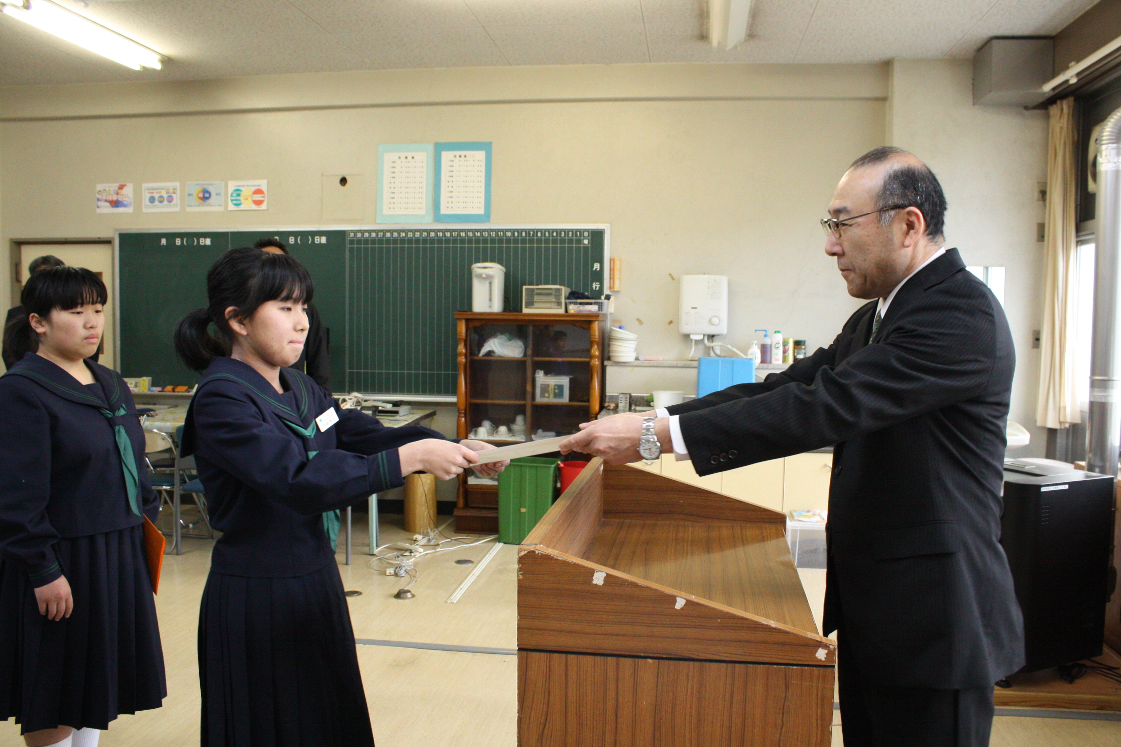中学3年生が生徒会長、2年生が副会長に任命され、校長先生から任命証を授与されました。