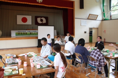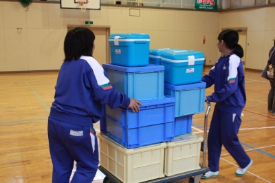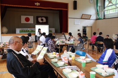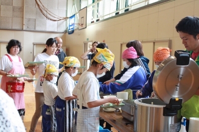 保護者の方や地域の方々をお呼びし、一緒に体育館で給食を食べました。