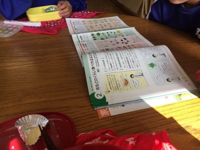 教科書を見ながら、食材を『1群』『2群』と分類したり、中学2年生とクイズを出し合ったりしながら食べていました。