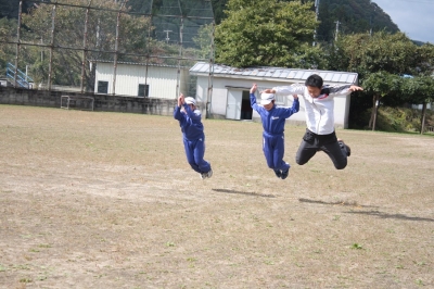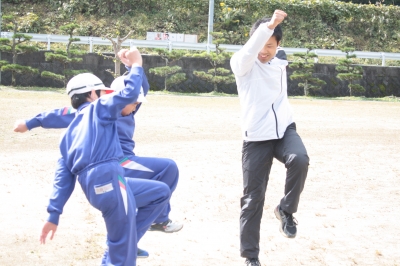 二人の児童は、アドバイザーの先生の跳躍力に圧倒されていました。