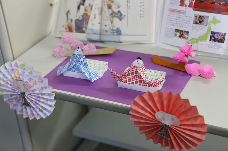 図書室はもう、桃の節句の準備が整いました。学校司書さんが千代紙で手作りしてくださった、かわいらしい雛飾りが図書室に彩りと和の雰囲気を加えてくれています。