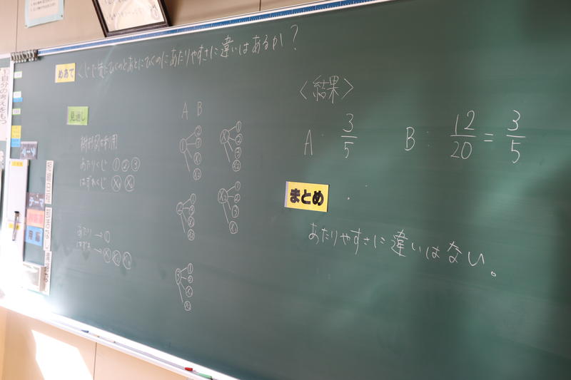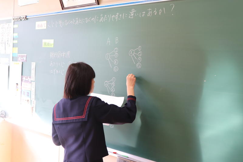 今日の1校時に、2年生・数学の研究授業が行われました。今日は確率の学習です。「5本のくじのうち当たりくじは3本あり、これを2人で引くとき、先に引くときと後に引くときの当たりやすさは同じか?」という問題を考えました。