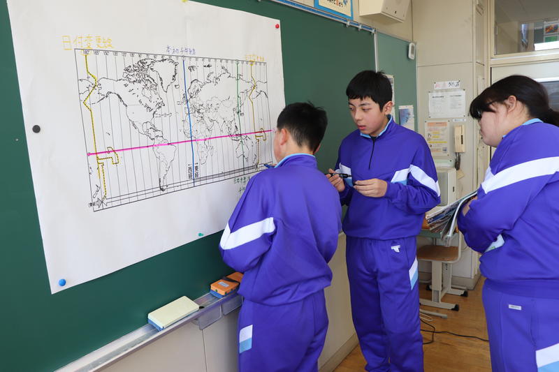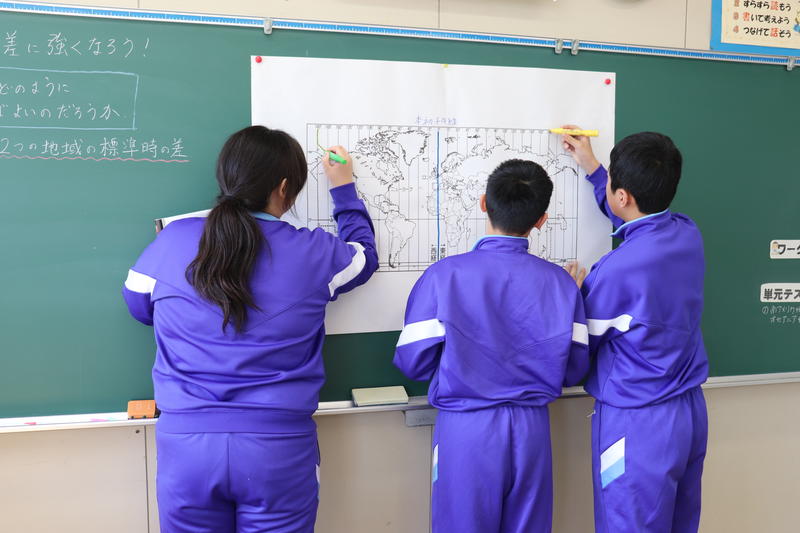 こちらは1年生の社会の授業です。今日は時差の学習です。