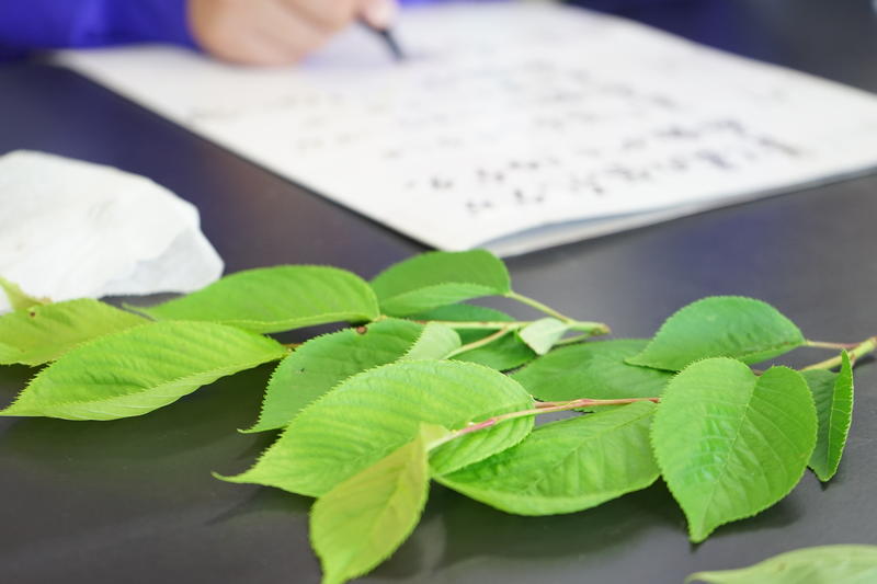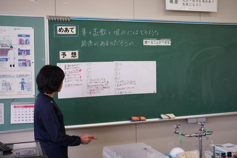 1年生の理科では、学校の桜の葉を使って蒸散と給水の関係を考えました。葉の片面にワセリンを塗ったものを作るなど、様々な場合において予想・観察・考察・発表しました。