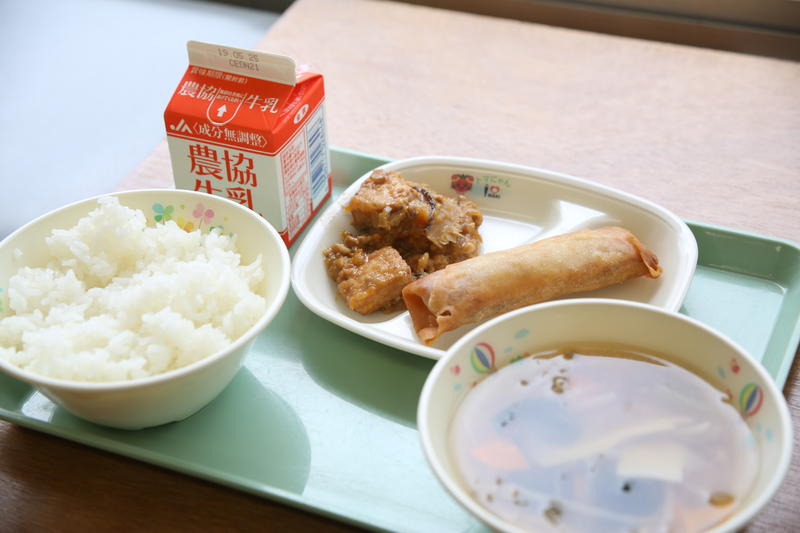 今日の給食は、春巻き、麻婆厚揚げ、ワンタンスープです。春巻きは野菜もたっぷり入っていて、揚げ加減が絶妙でパリッとした食感でした。麻婆厚揚げは和のテイストの、味噌がたっぷり入った、栄養満点の料理です。どれも熱々で、心も体も温まるおいしい給食でした。