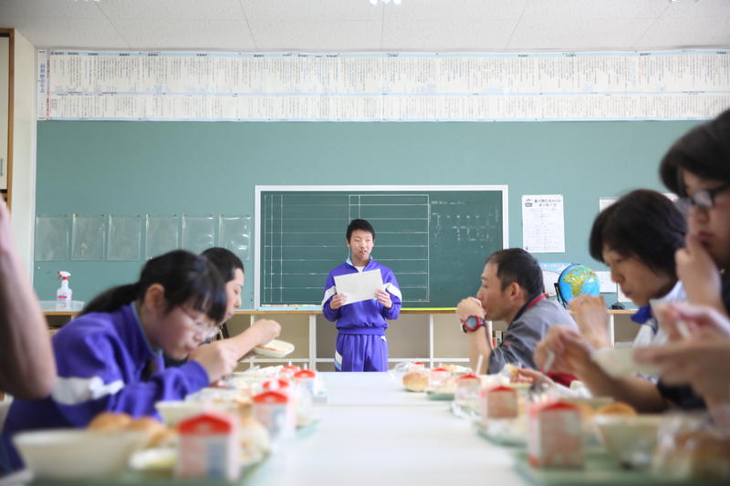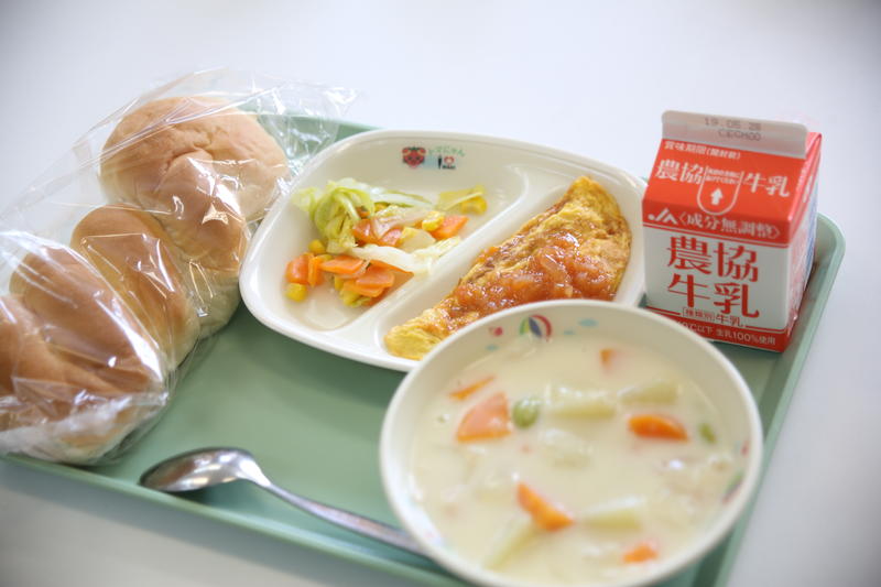 なぜ運動会?実は紅組と白組に別れているのです。オムレツのトマトソースは紅組、ホワイトソースは白組で、いわき産のトマトの酸味のきいた、調理員さん手作りソースのオムレツと、チーズと生クリームの入った濃厚な味わいのシチューの味の対戦。そして、「ねじりパン」は運運動会の定番の「綱引きパン」なのです。運動会、みんなで盛り上げていきます!