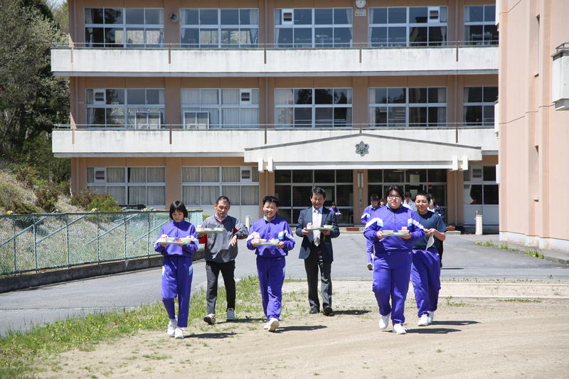 5月1日より、新しい時代「令和」になりました。今日は、抜けるような青空の広がる天気に恵まれ、気持ちのいい日となりました。校庭西側のぼたん桜も咲き、東側の木々も新緑となり絶好のお花見チャンス。小学生と中学生が一緒になり、楽しく会話をしながら給食を食べました。