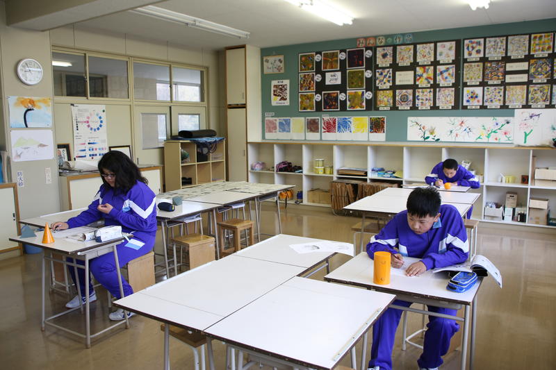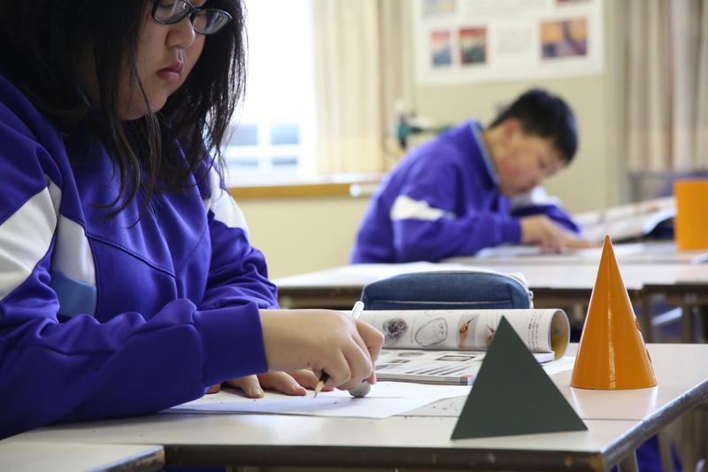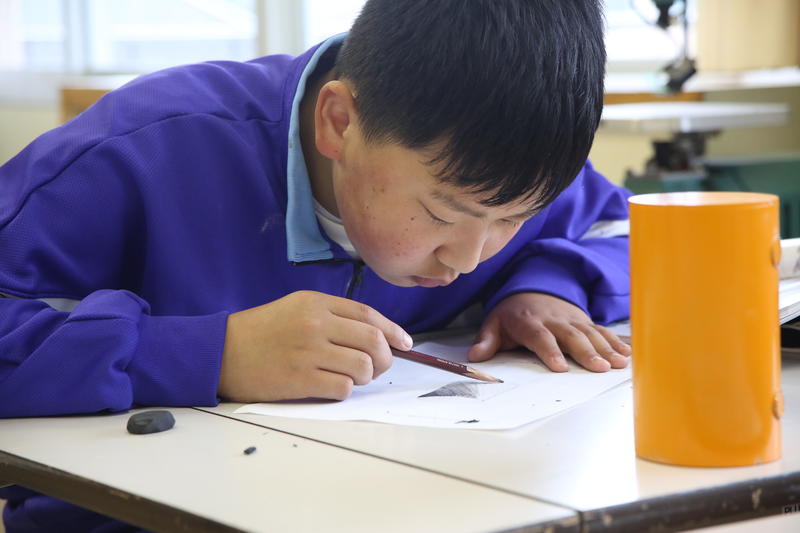 1年生美術で、デッサンを行っています。本日は立体模型を使って光と影、曲面の感じを表現します。少しずつ表現できるようになってきました。皆真剣そのもの、よく頑張りました。