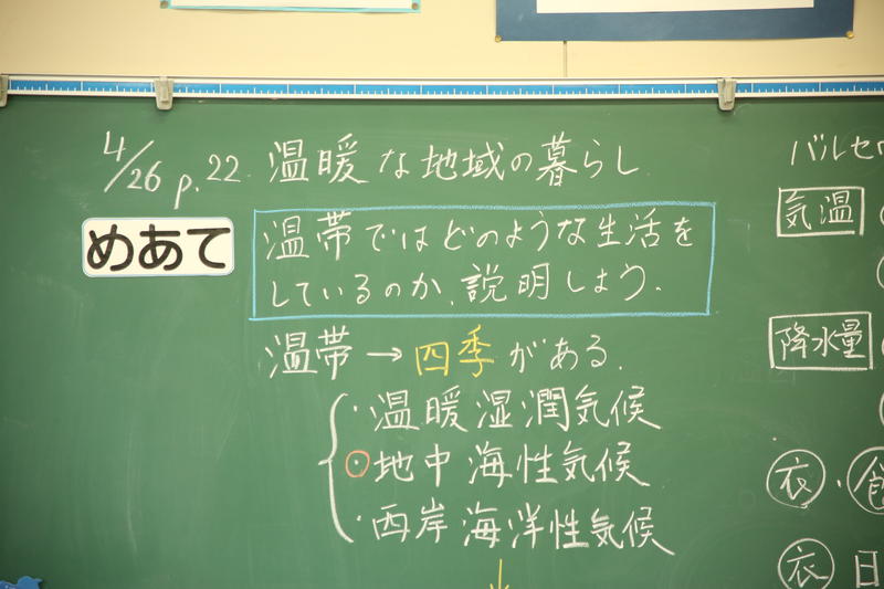 本日ほ1年生の社会では温帯地方の生活について学びました。温帯の地方の様々な特徴を見つけ、そこに暮らす人々がどの様な生活をしているか考えました。