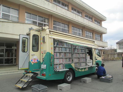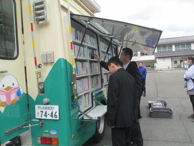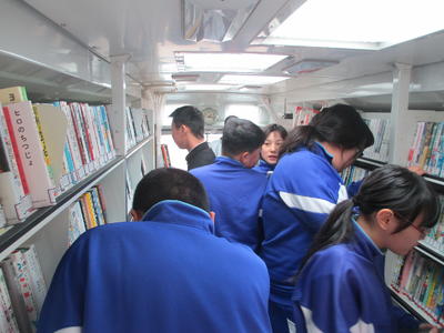 本日の昼休み,移動図書館で本を探す姿が見られました。