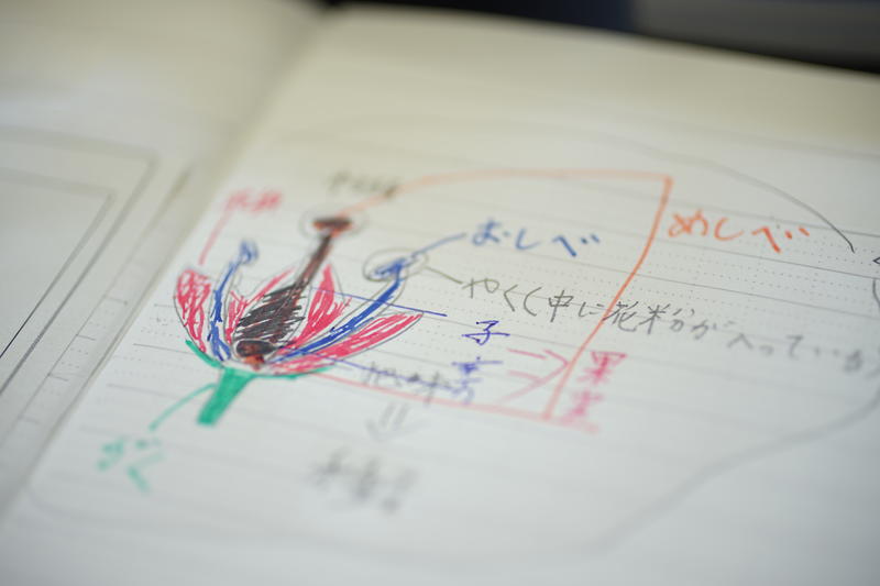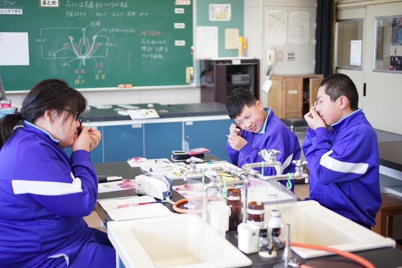 1年生の理科では、花の観察を通して共通する部分を探す授業でした。生徒達は、じっくりと興味深く観察しました。