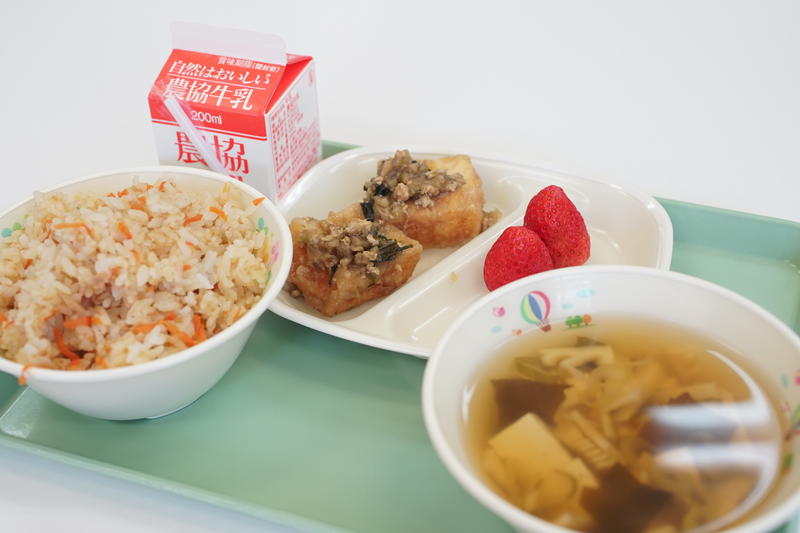 今日の給食の献立は、揚げ豆腐のそぼろあんかけ、わかたけ汁、イチゴ、そして生徒達の大好きなツナご飯です。とてもボリュームがあって元気が出る和食料理です。わかたけ汁は、季節感満点の日本料理の素晴らしさも味わえる、あっさりしていて出汁のきいた料理です。