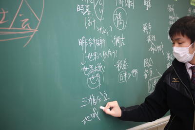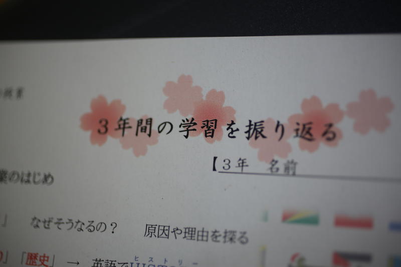 3年生の社会では、3年間の振り返りを行いました。3年間の社会の3分野「地理」「歴史」「公民」のそれぞれにおいて、どんなことを学習してきたか、印象に残った学習内容とその理由などをプリントにまとめ発表しました。