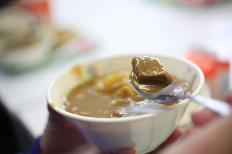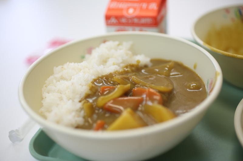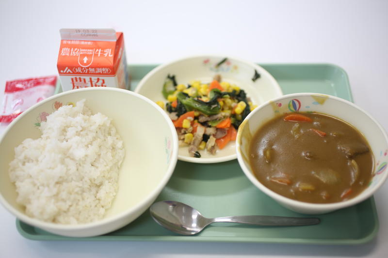 本日の給食のメニューは、ビーフカレー、小松菜とベーコンのソテーです。カレーには大粒の具が沢山入っていました。勿論、ビーフカレーですので、大粒の牛肉のブロックも入っています。とても贅沢でおいしい給食をいただきました。