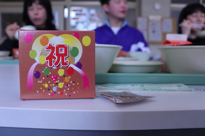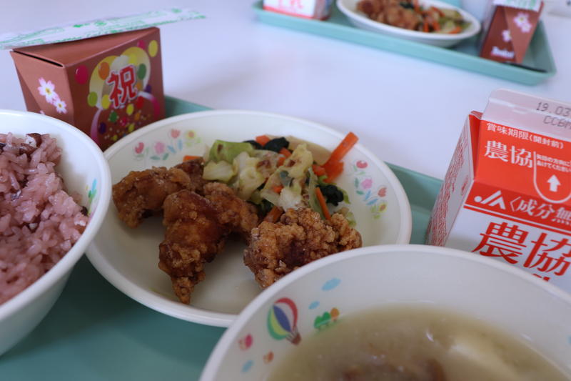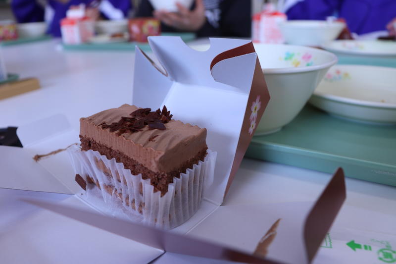 本日は、3年生にとって最後の給食となりました。メニューは、生徒の大好きな「鶏の唐揚げ」、「チョコケーキ」をはじめ、卒業をお祝いする「赤飯」でした。
