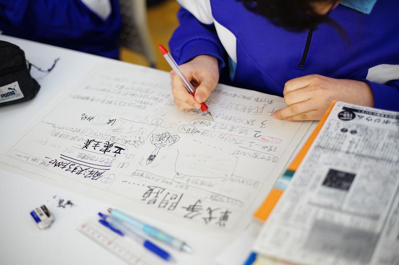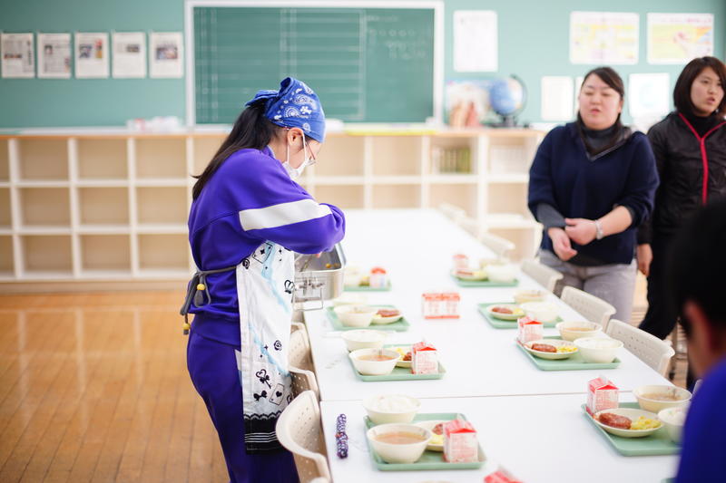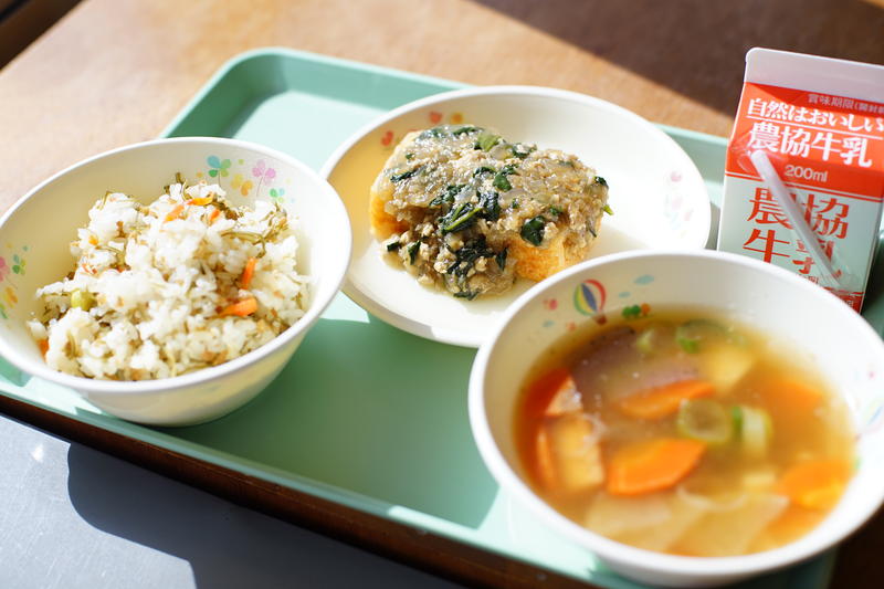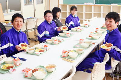 給食の中に調理員さんのハートが沢山。それをいただいた男子生徒は喜びを隠しきれない様子でした。