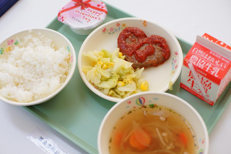 2019年2月14日 13時33分今日の給食は、「バレンタインデー給食」でした。調理員さんの愛情が、沢山込められている給食です。料理のメニューは「キャベツソテー」、「ハンバーグ」、「オニオンスープ」、デザートに「チョコプリン」です。