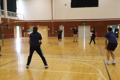 3対3に分かれてゲーム形式 目標は、三段攻撃で相手コートへボールを返すこと!