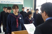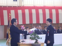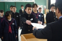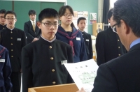 校長式辞に続き、新2年生の小板橋さん、新3年生の長谷川君に教科書が授与されました。