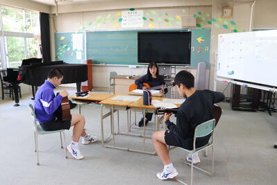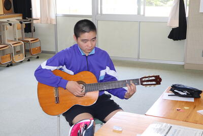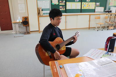ギターの学習を行っていました。左手で弦を押さえるのに苦労しながらも、頑張っていました!!