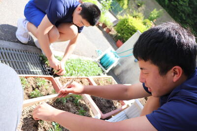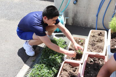 昼休みには、地区の方からいただいたマリーゴールドをプランターへ!