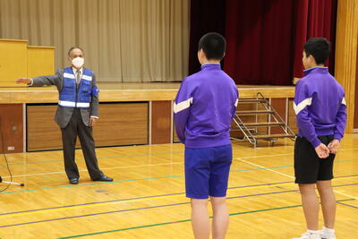 直ちに駆けつけた先生方が不審者をとりおさえ、生徒を守ってくれました!!さすまたの使い方も、今までの訓練のおかげで、バッチリです。この後、講師の先生から、改めてさすまた等を使った制圧の方法について御指導いただきました。