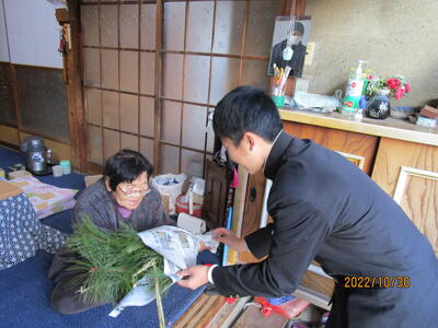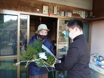 午後は、民生委員さんの先導のもと、桶売地区に住む高齢者の皆さんのお宅へ正月飾りを届けに行きました。