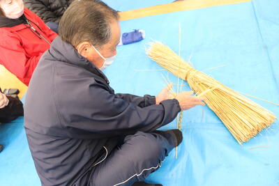 まずは、しめ縄作り。講師の先生のお手本をじっくり観察して~
